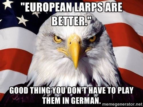 auf der Suche nach LARP Memes bin ich über ein tumblr Blog gestoßen: http://larpmemes.tumblr.com/ . Durch die Memes habe ich den Eindruck bekommen, dass LARP dort eine Art Sport Jugger mit Plot ist. Gefühlt würde ich sagen unser LARP vor 8-9 Jahren.