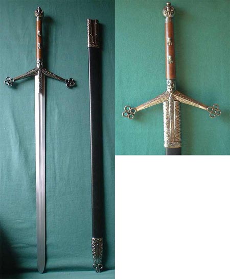 es ist kein spanisches, sondern ein schottisches "claymore" schwert. zweihänder. diverse details verraten, dass es sich um ein zierschwert und keinesfalls um ein schwert handelt mit dem man im schaukampf etwas anfangen könnte.